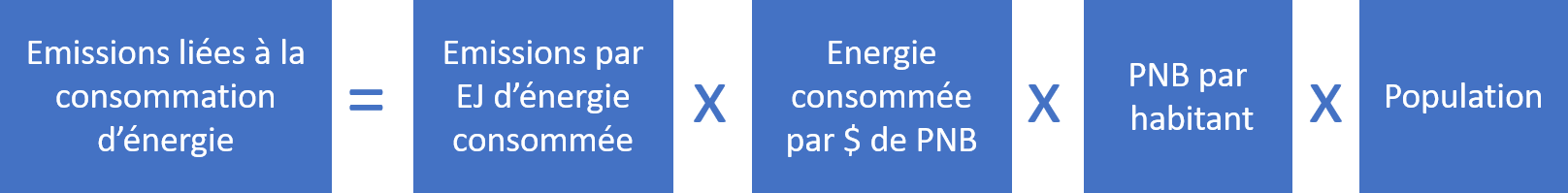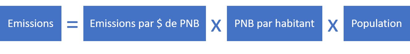 En ce qui concerne les émissions de gaz à effet de serre liées à la production et à la consommation d’énergie, nous pouvons affiner le modèle précédemment présenté par la décomposition du facteur « émissions par $ de PNB » en deux facteurs : l’énergie primaire consommée par $ de PNB (dit intensité énergétique) et les émissions par Exa Joule d’énergie consommée (intensité carbonique).