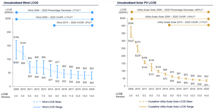 L’évolution des coûts de l’éolien et du solaire en $ par MWh